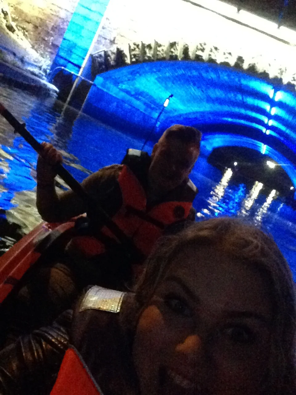 A kayaking selfie taken after passing under one of the illuminated bridges in the canal system. You can buy waterproof phone carry cases to prevent you drowning and/or losing your phone.